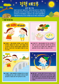 정월 대보름날은 한 해의 첫 보름으로 음력 1월 15일이다. 태고적 풍속은 대보름을 설처럼 여기기도 했다. 조선 후기에 간행된 《동국세시기(東國歲時記)》에 의하면 대보름에 밤에 잠을 자면 눈썹이 하얗게 변한다고 하여 온 집안에 등불을 켜 놓고 밤을 새웠다고 전해진다. 정월대보름 아침에는 땅콩, 호두, 은행 등 견과류를 깨물어 먹어 부스럼이 나지 않고 일 년 동안의 무사태평을 기원했다. 정월대보름에는 풍요와 다산을 기원하며 줄다리기, 지신밟기, 다리 밟기, 쥐불놀이, 달집태우기 등을 했다. 또 더위팔기, 귀밝이술 마시기 등의 풍습이 전해진다.