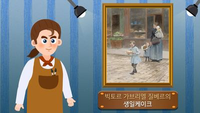 작품소개 - 파리지앵의 일상을 사실적으로 묘사한 질베르의 채색은 행복하고 조용한 하모니가 돋보입니다. 여인과 아이들 그리고 파리 거리의 각종 시장 분위기, 케이크를 들고있는 아이의 생동감있는 표정과, 꽃을 든 아이의 손을 잡고 쳐다보는 여인의 따뜻한 표정을 섬세하게 표현하였습니다.